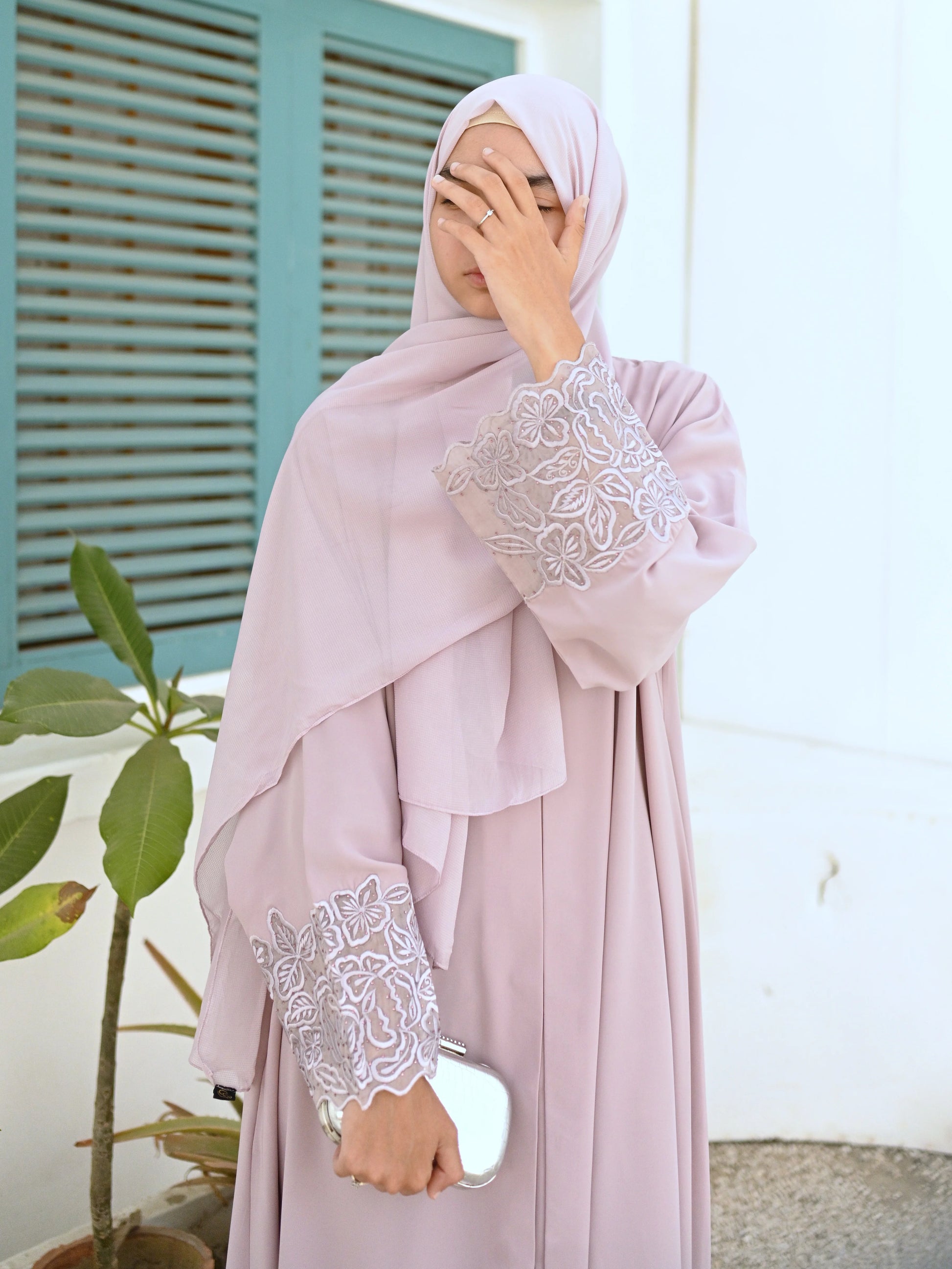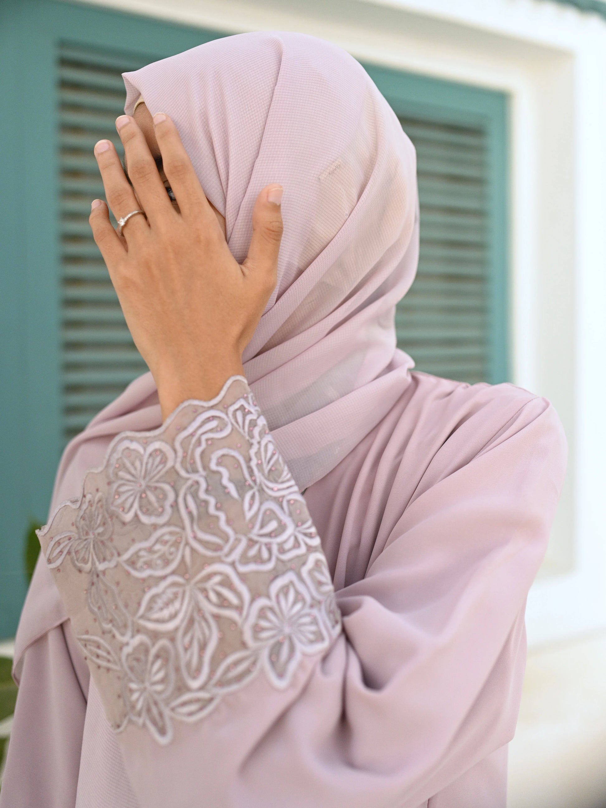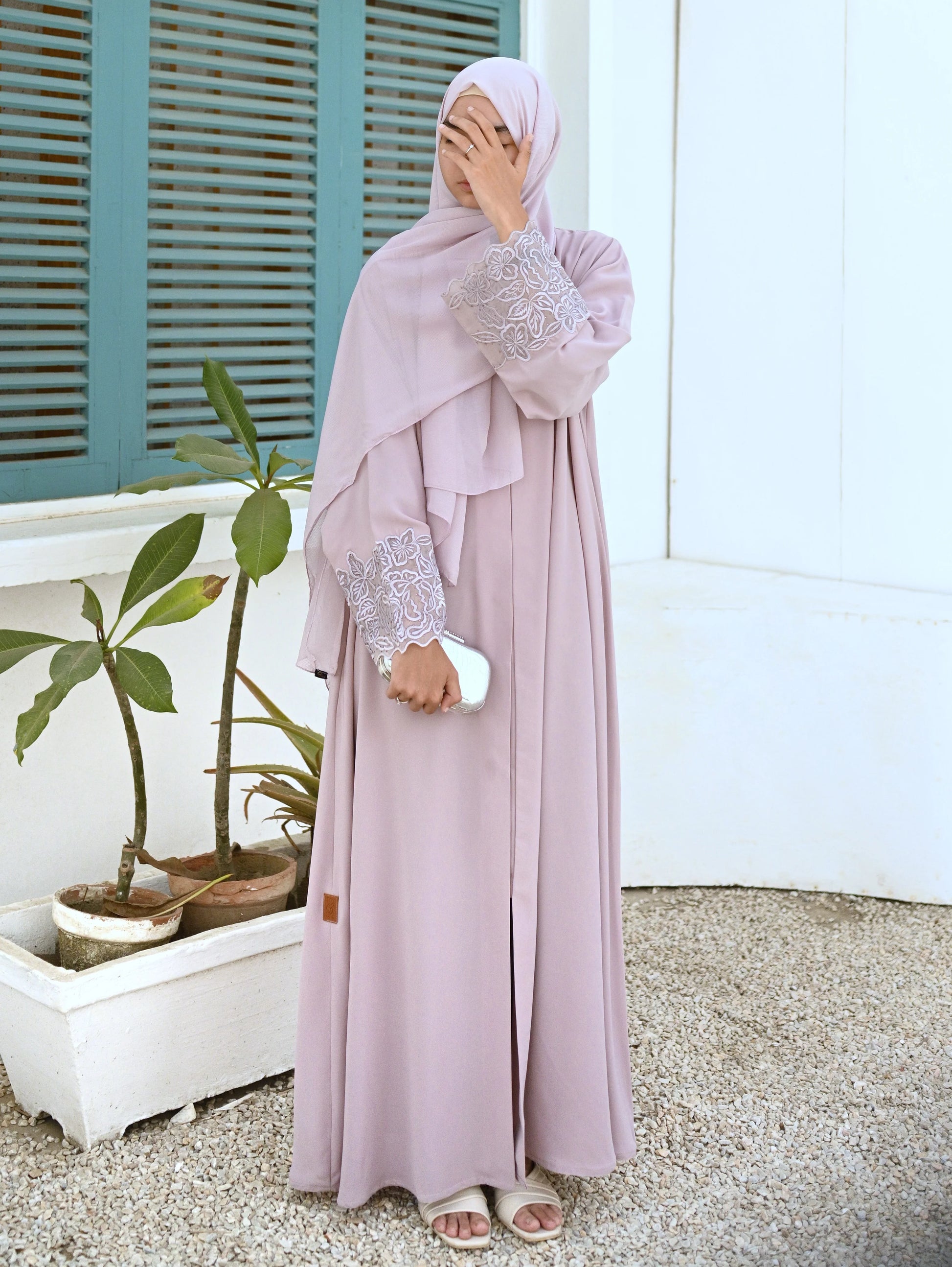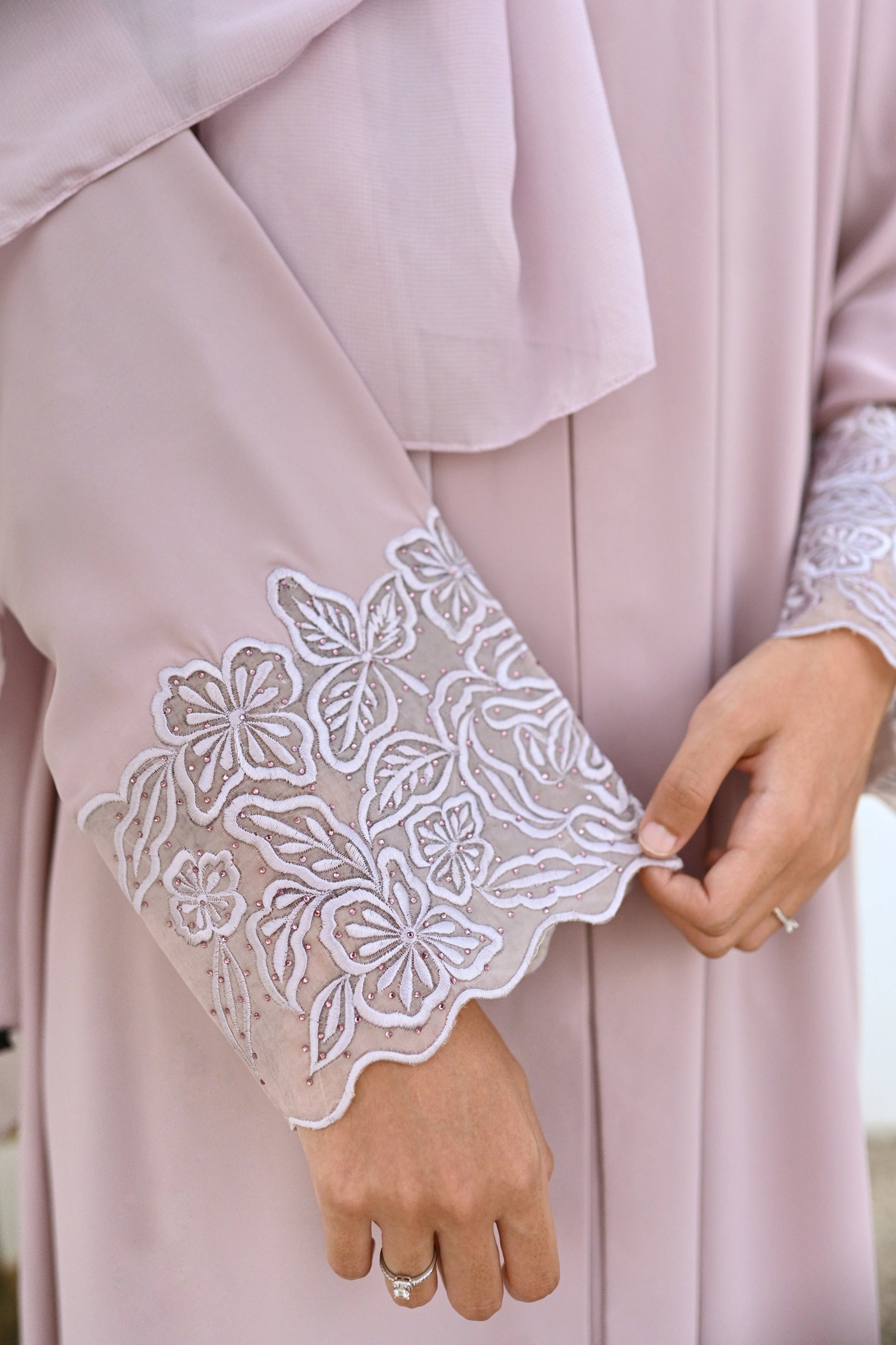 The abaya features intricate organza applique embroidery adorned with subtle diamante detailing, adding a touch of shimmer and grandeur to your ensemble. Its soft mauve tone creates a feminine, luxurious appeal suitable for weddings, festive gatherings, or special celebrations.
