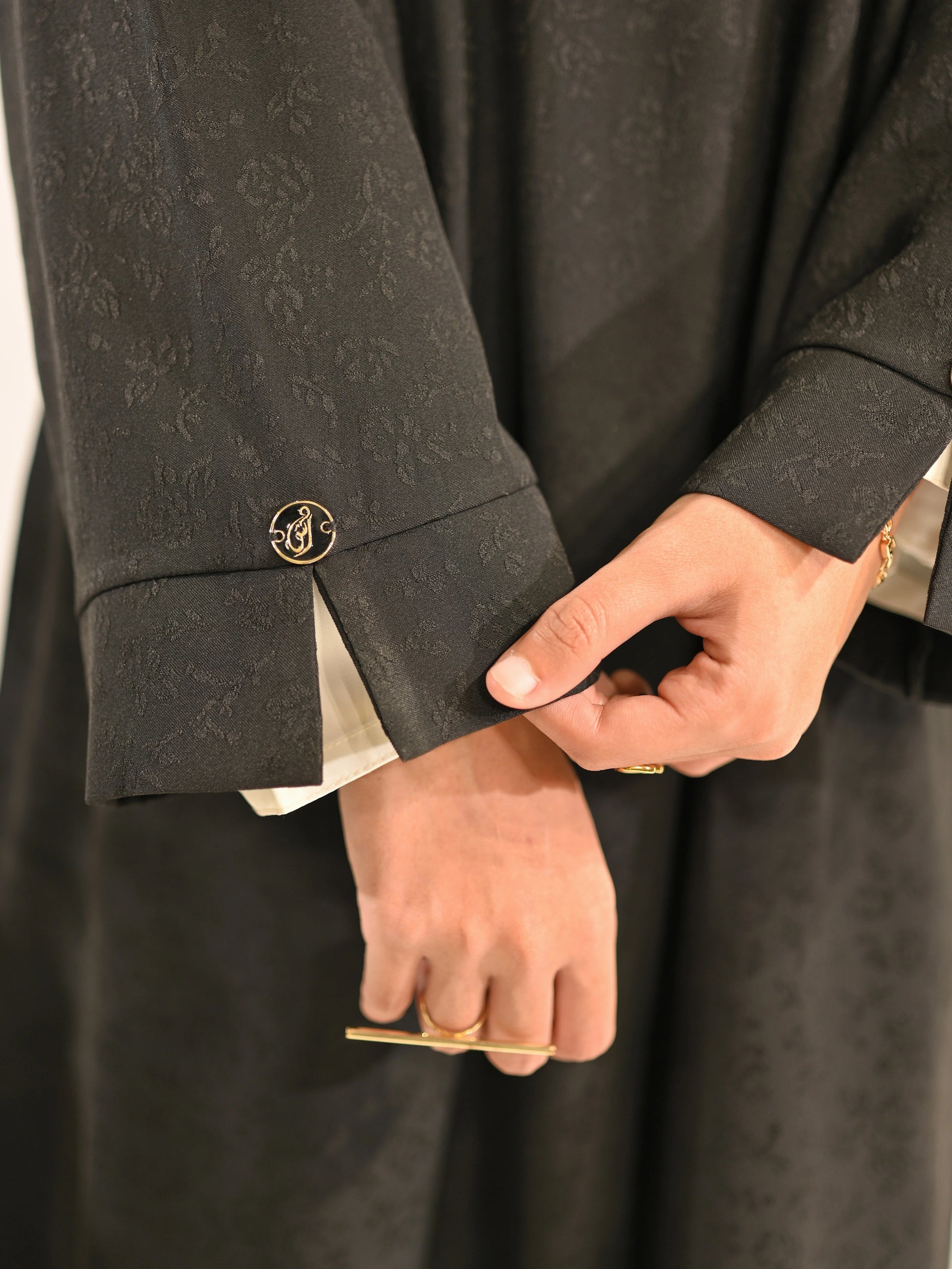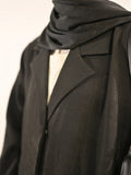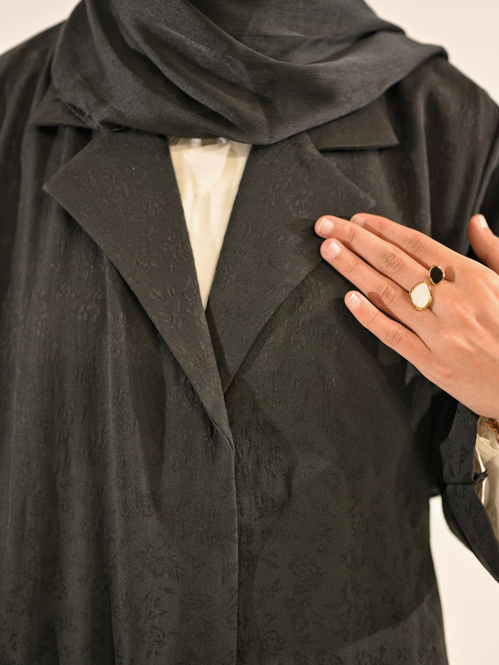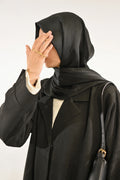 Designed for the modern modest wardrobe, this black blazer abaya blends structure with elegance through its tailored silhouette and subtle self print texture. The blazer-style collar introduces a sharp, contemporary edge while maintaining the graceful flow of an abaya.