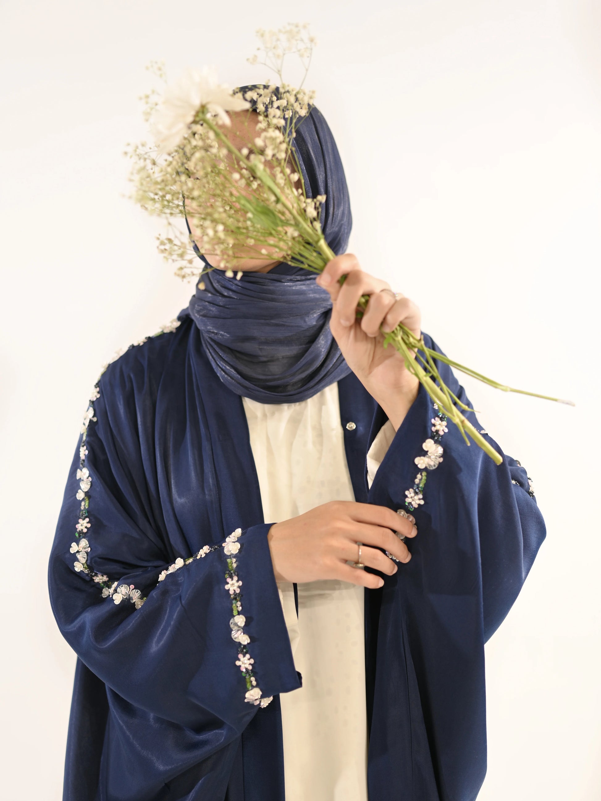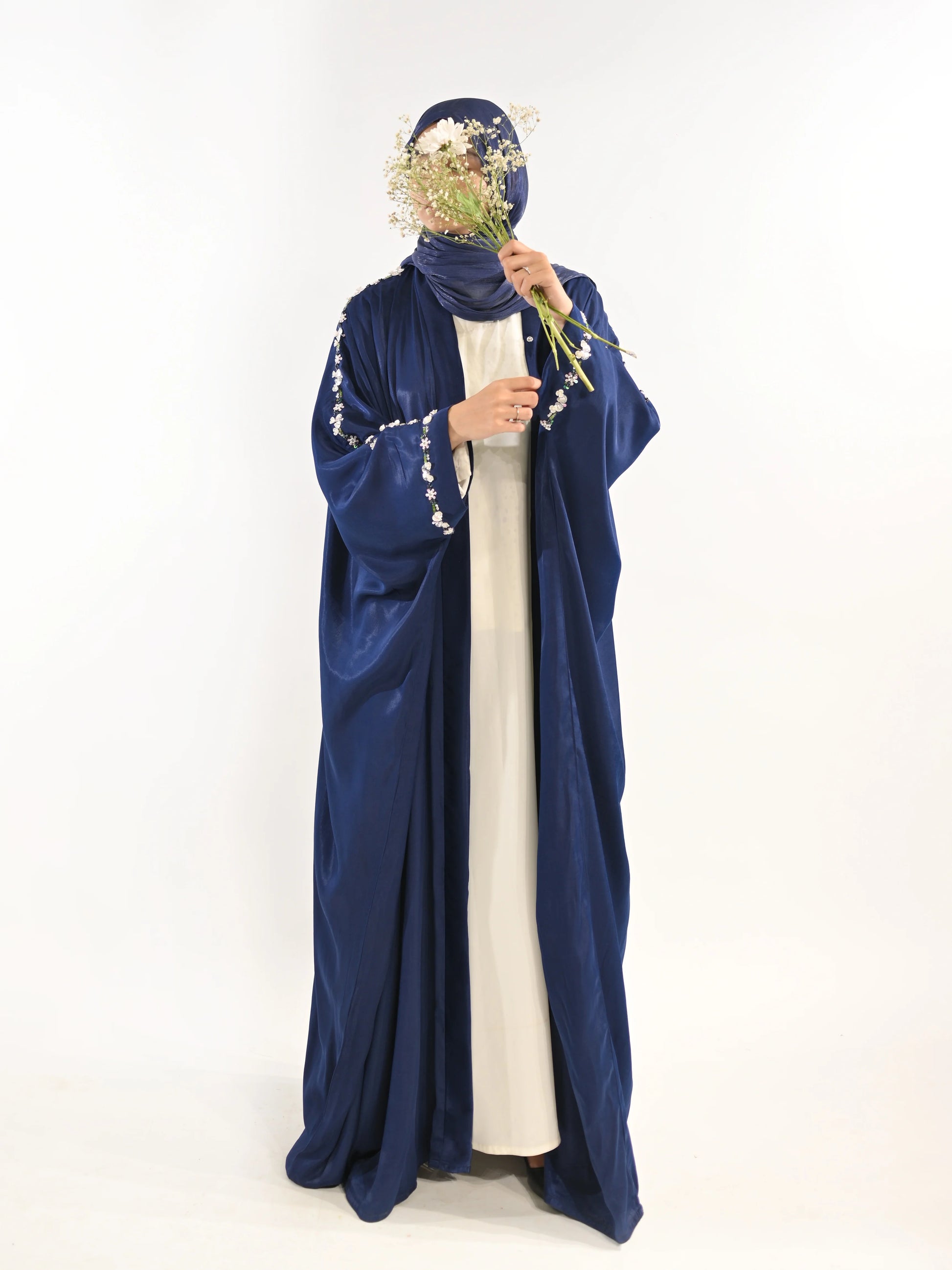 Designed with timeless elegance, this blue silk abaya features a refined Emarati-inspired kimono silhouette in a graceful front-open style. Crafted from smooth, soft silk with an opaque finish, it offers a fluid drape that enhances movement while maintaining a polished appearance.