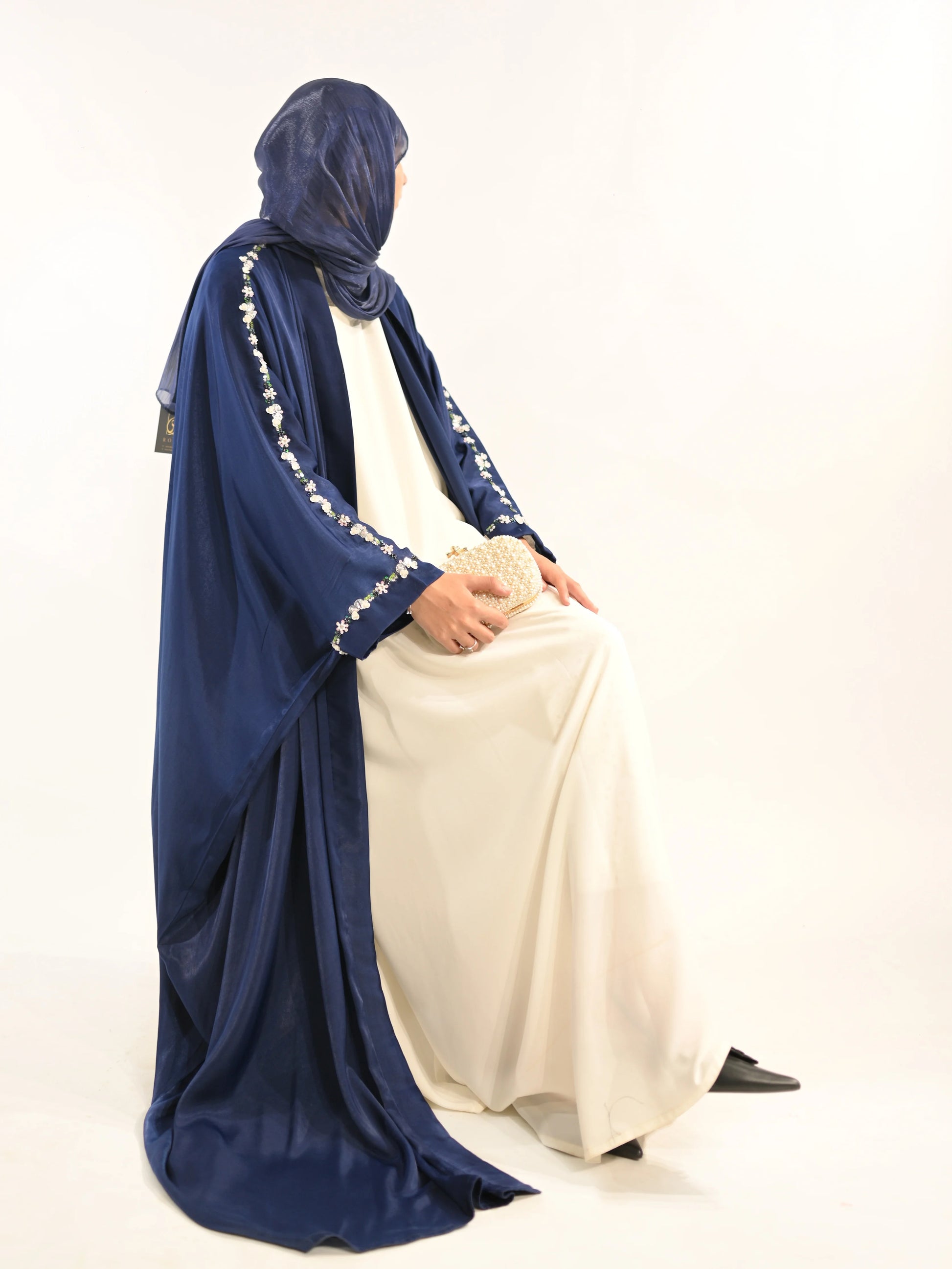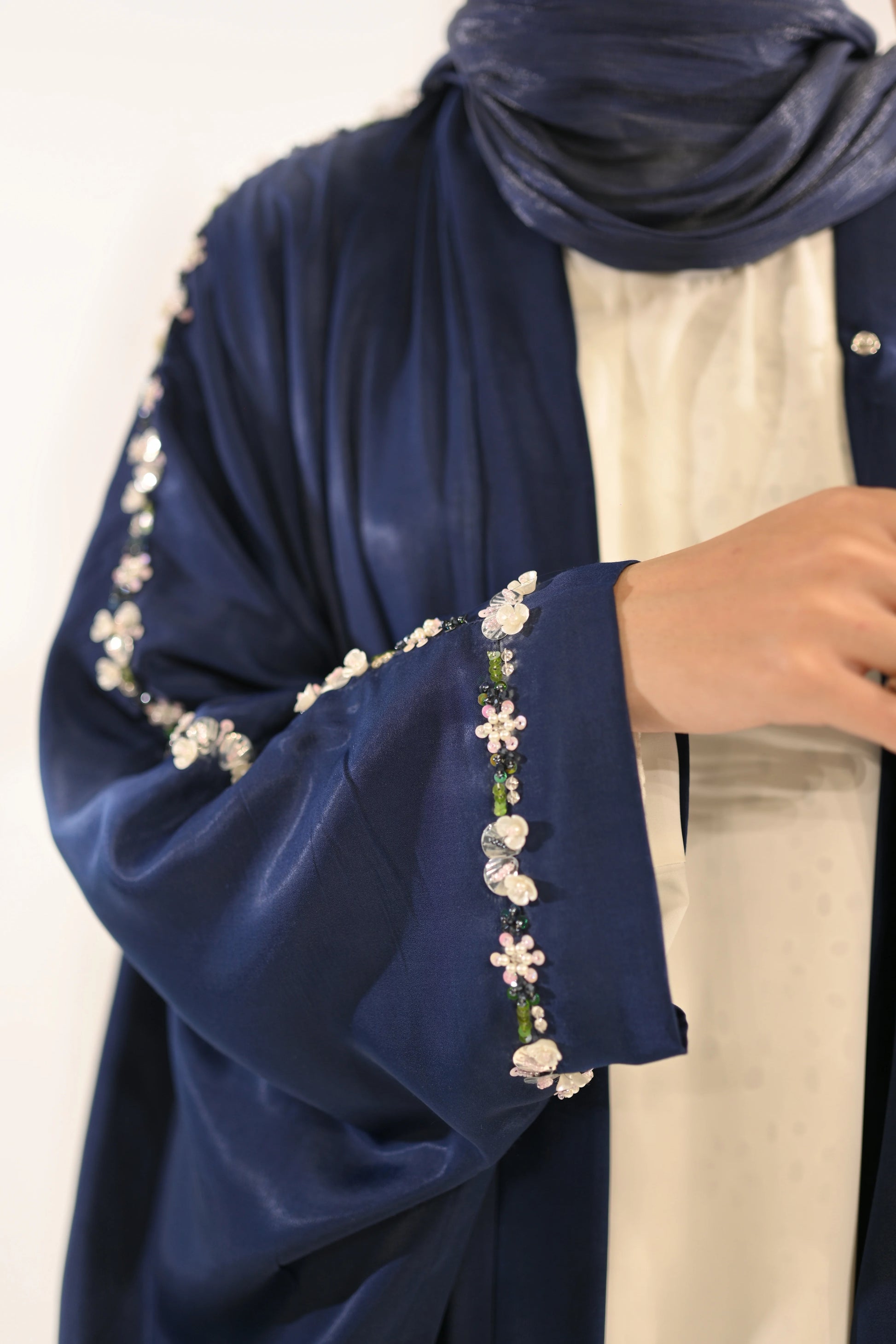 Delicate bead and crystal handwork on the sleeves and shoulder seam introduces subtle brilliance, adding depth and artistry to the clean structure. The front-open design allows versatile layering and effortless styling, making it suitable for formal occasions and elevated modest wear.