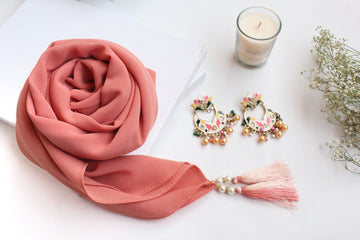 What truly sets this hijab apart is the dual-color satin thread tassels delicately finished with pearl accents, creating a sophisticated look that adds just the right amount of charm and detail to any outfit. Whether paired with a simple dress or an embellished ensemble, the Luxe Hijab Dalia adds a luxurious final touch to your appearance.