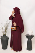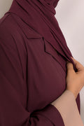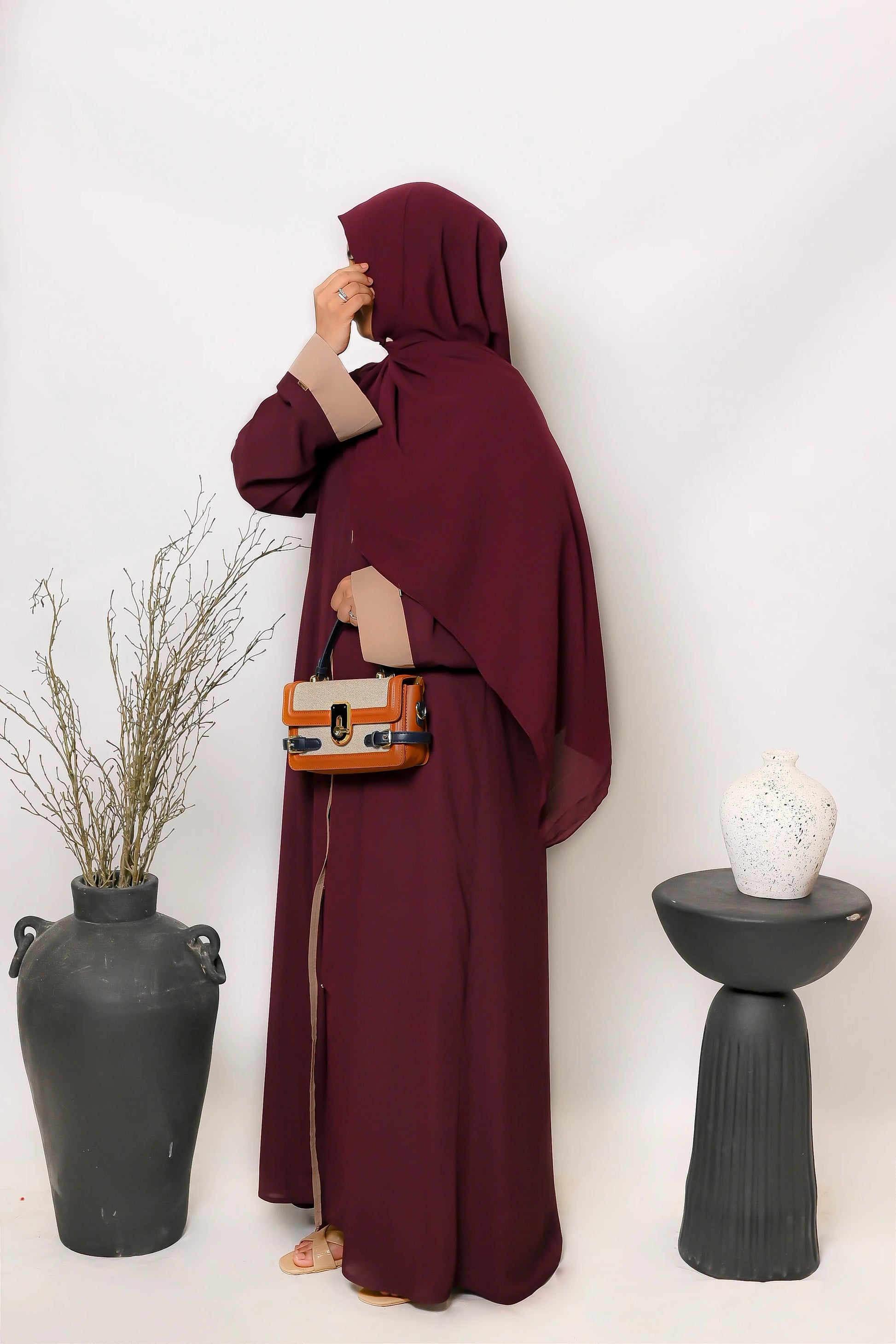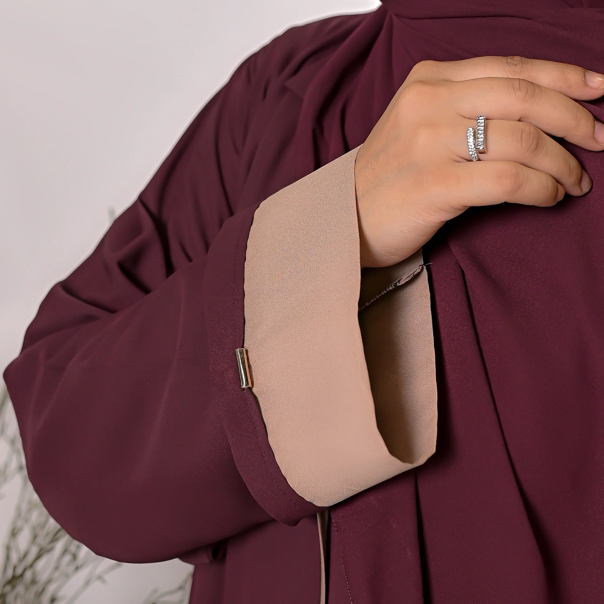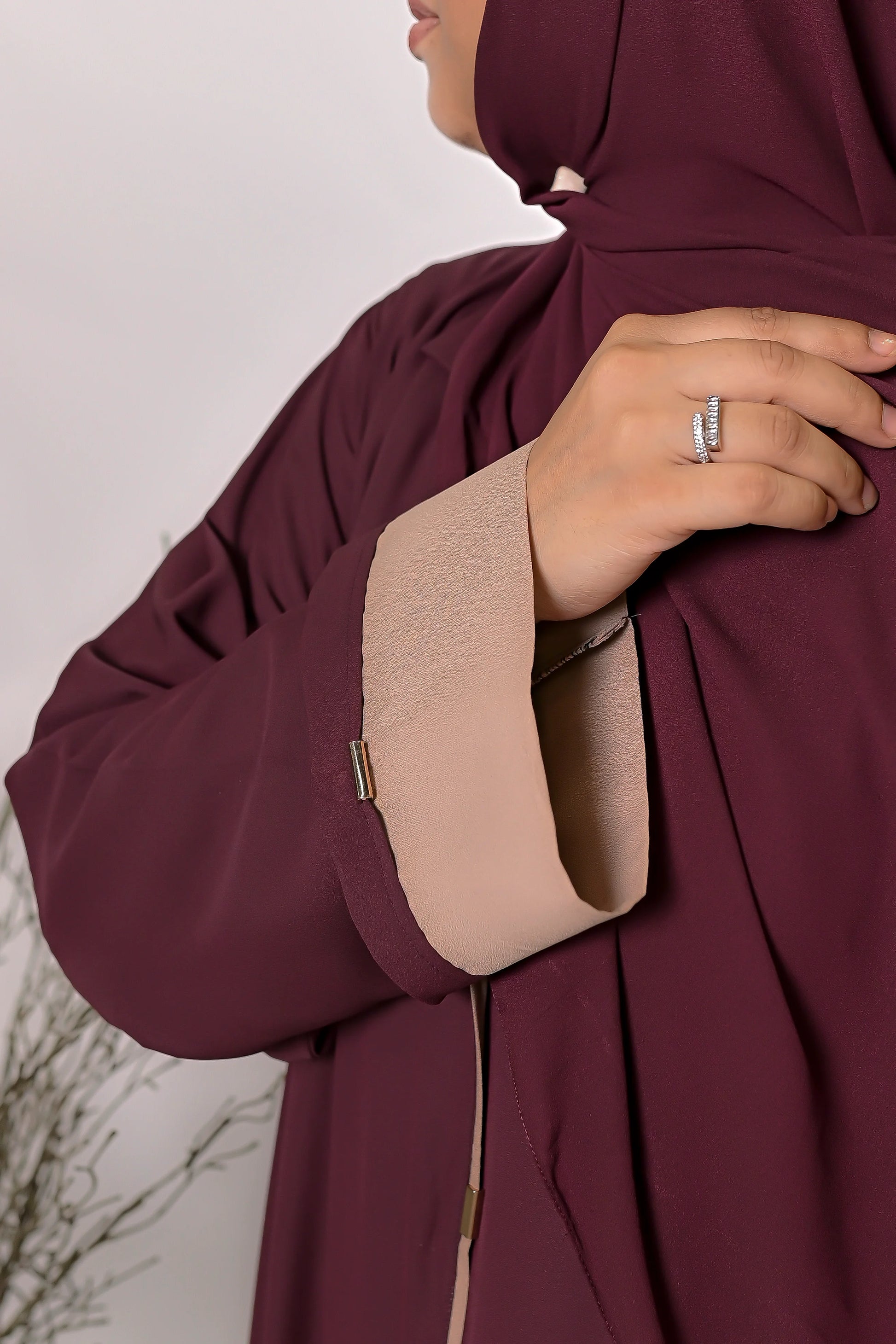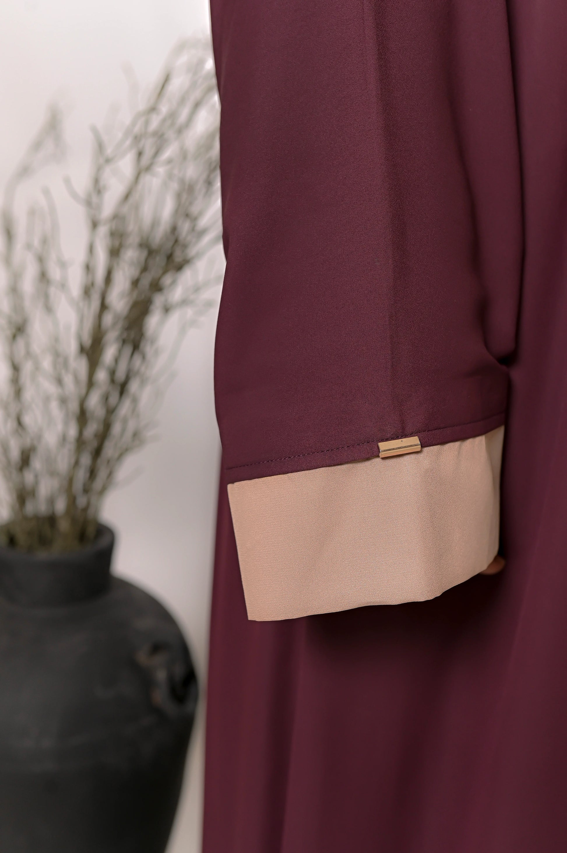 Refined and stylish, this mahogany abaya features taupe finishing. Designed for modern modesty with a fashionable sleeve cut and added convenience of a pocket.