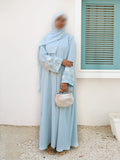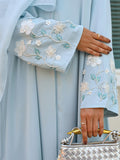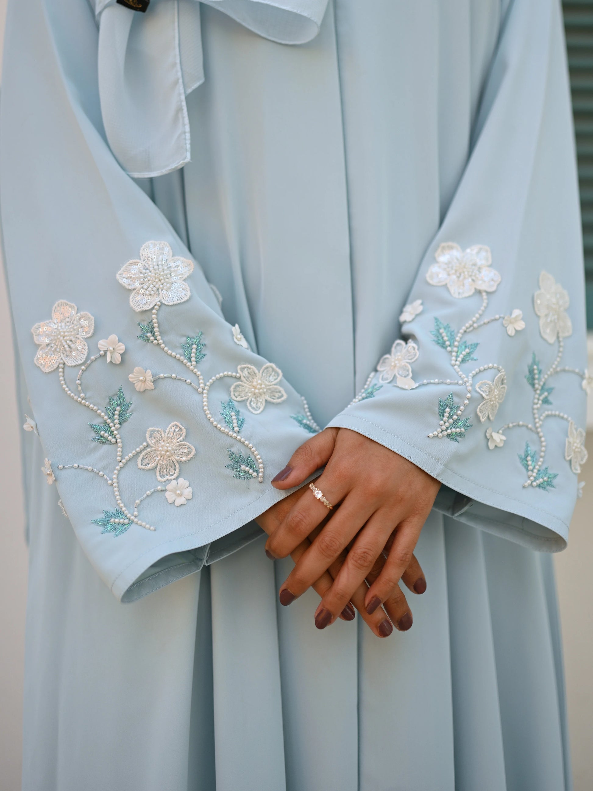 The abaya features intricate 3D floral embellishments and fine bead handwork across the front and sleeves, capturing the light with every movement. The soft sky tone radiates calm luxury, making it a standout choice for celebrations, weddings, or elegant evenings.
