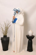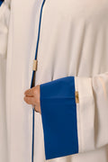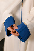 Gracefully minimal, this white abaya features elegant blue contrast piping and details on the sleeves. Subtle metal embellishments and a functional pocket add the perfect touch of style and practicality.