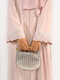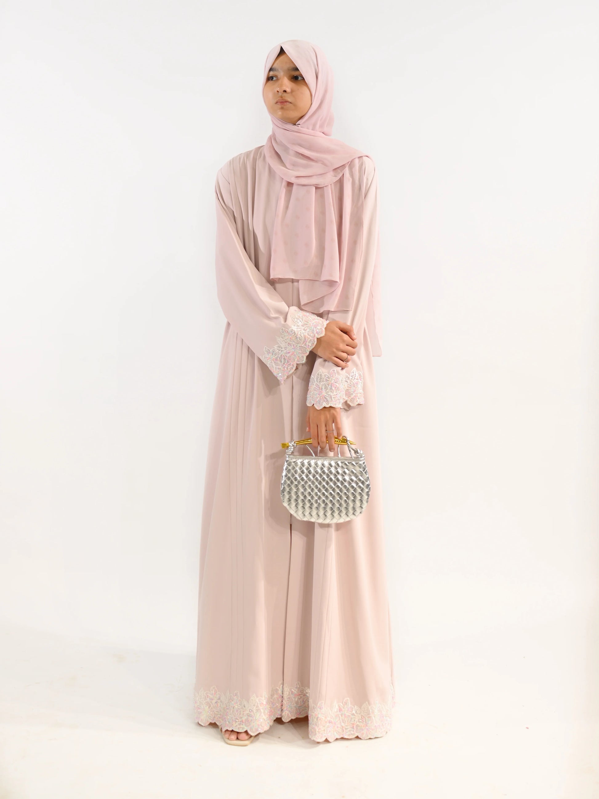 Refined elegance meets delicate craftsmanship. This premium ATY abaya is adorned with graceful bead cutwork on the sleeves and hem, complemented by subtle loop detailing with crystals for a timeless semi-formal look.