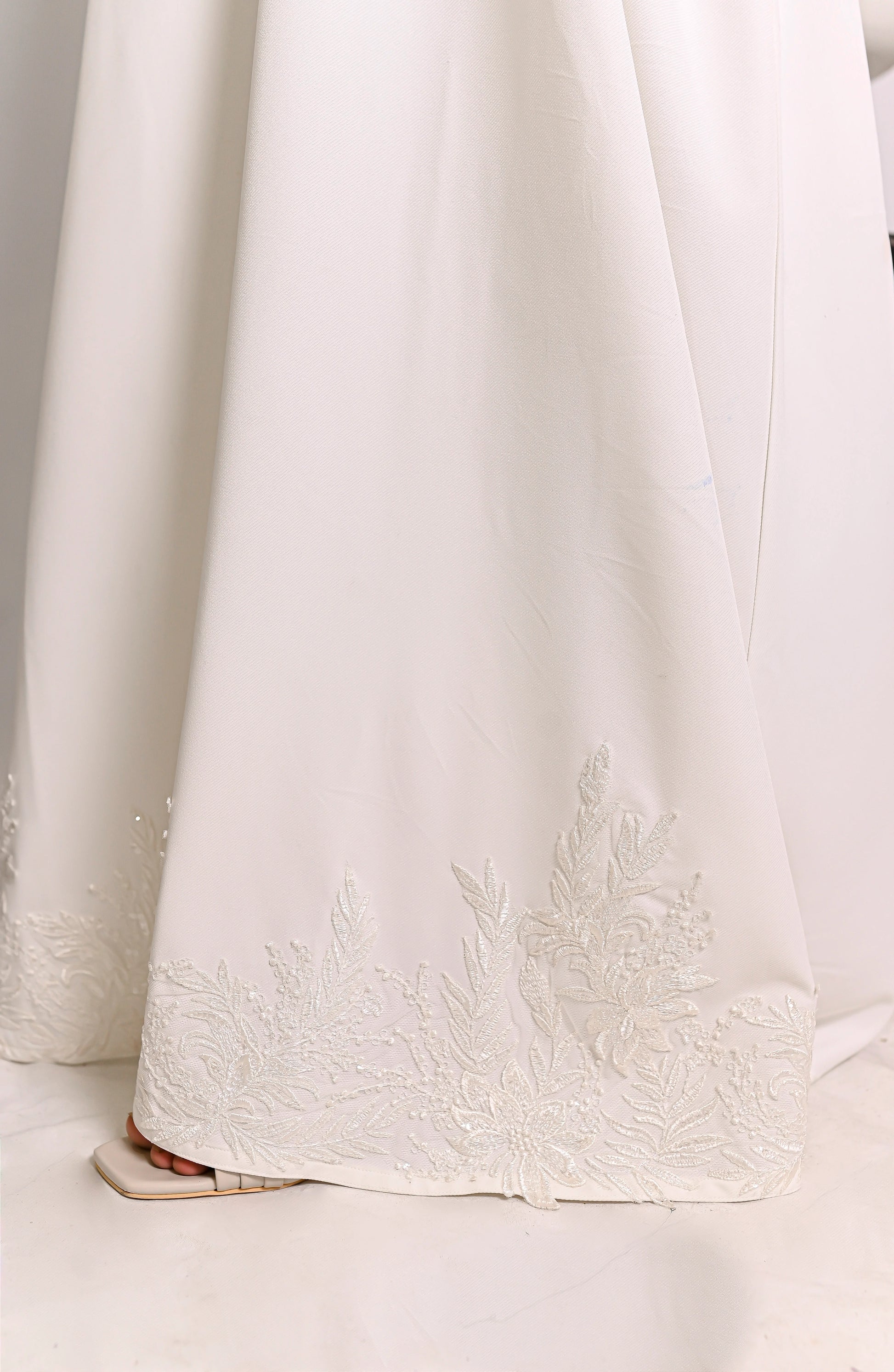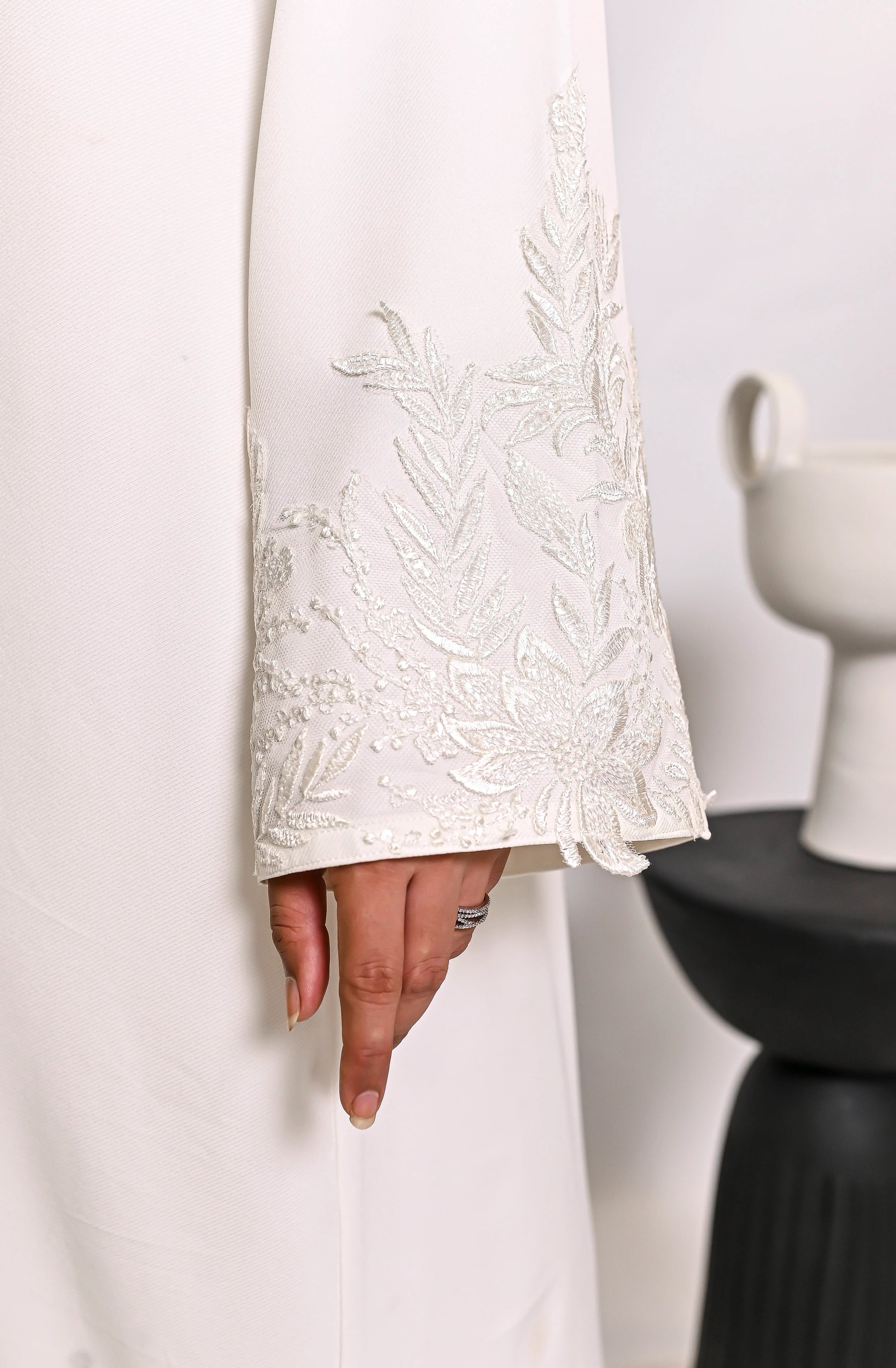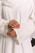 Graceful and elegant, this white abaya is crafted from ribbed texture georgette fabric with delicate white lace adorning the sleeves and bottom (daman). The lace is subtly embellished with transparent sequins for a refined, understated sparkle.