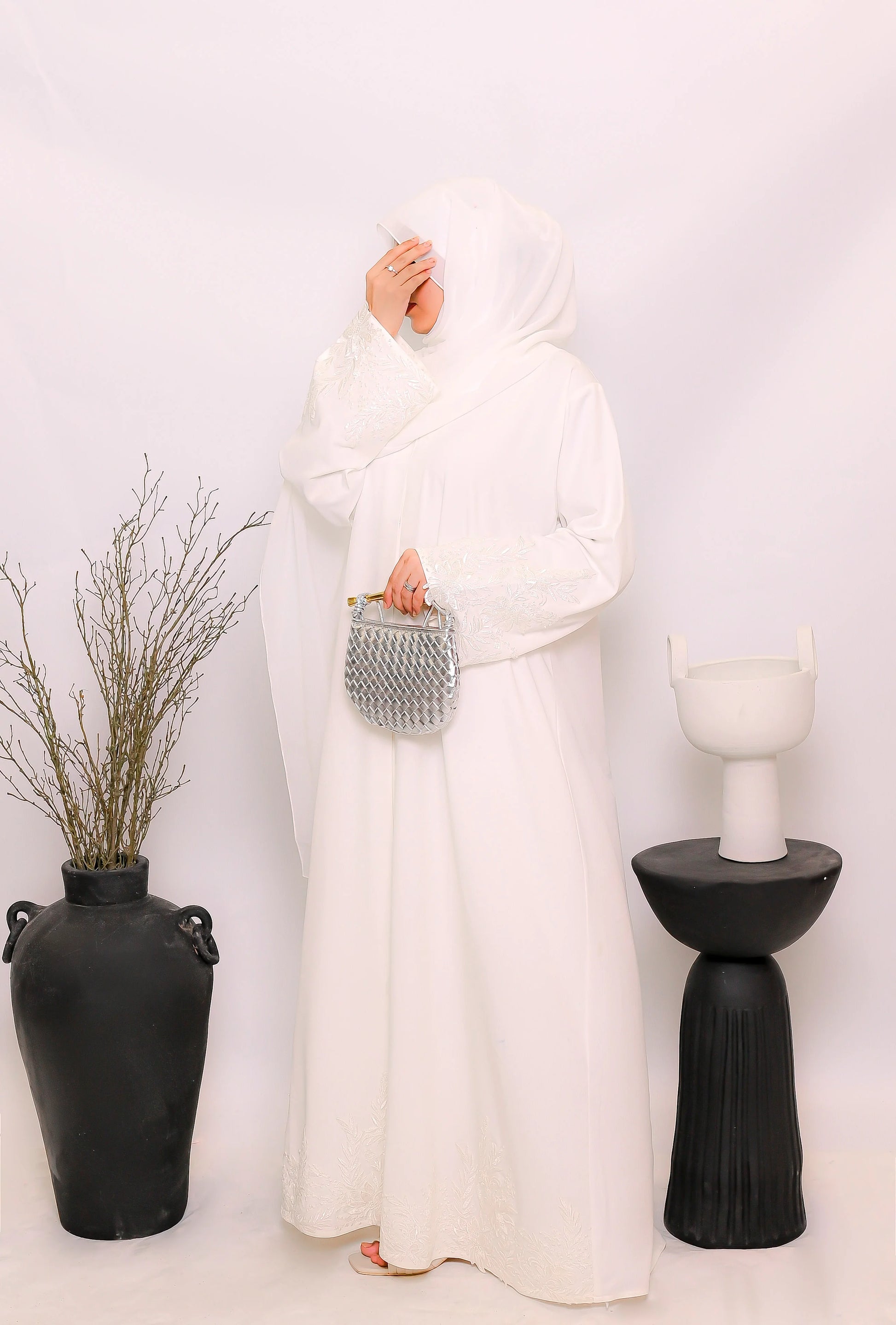 Exude timeless elegance with our White Abaya, crafted from premium ribbed texture georgette fabric for a subtle yet sophisticated look. The abaya is adorned with delicate white lace on the sleeves and bottom (daman), creating a refined finishing touch. The lace is further embellished with transparent sequins, adding a graceful and understated sparkle that enhances the abaya’s soft, luxurious appearance. Ideal for formal events, weddings, or any special occasion, this abaya combines modesty with elegance.
