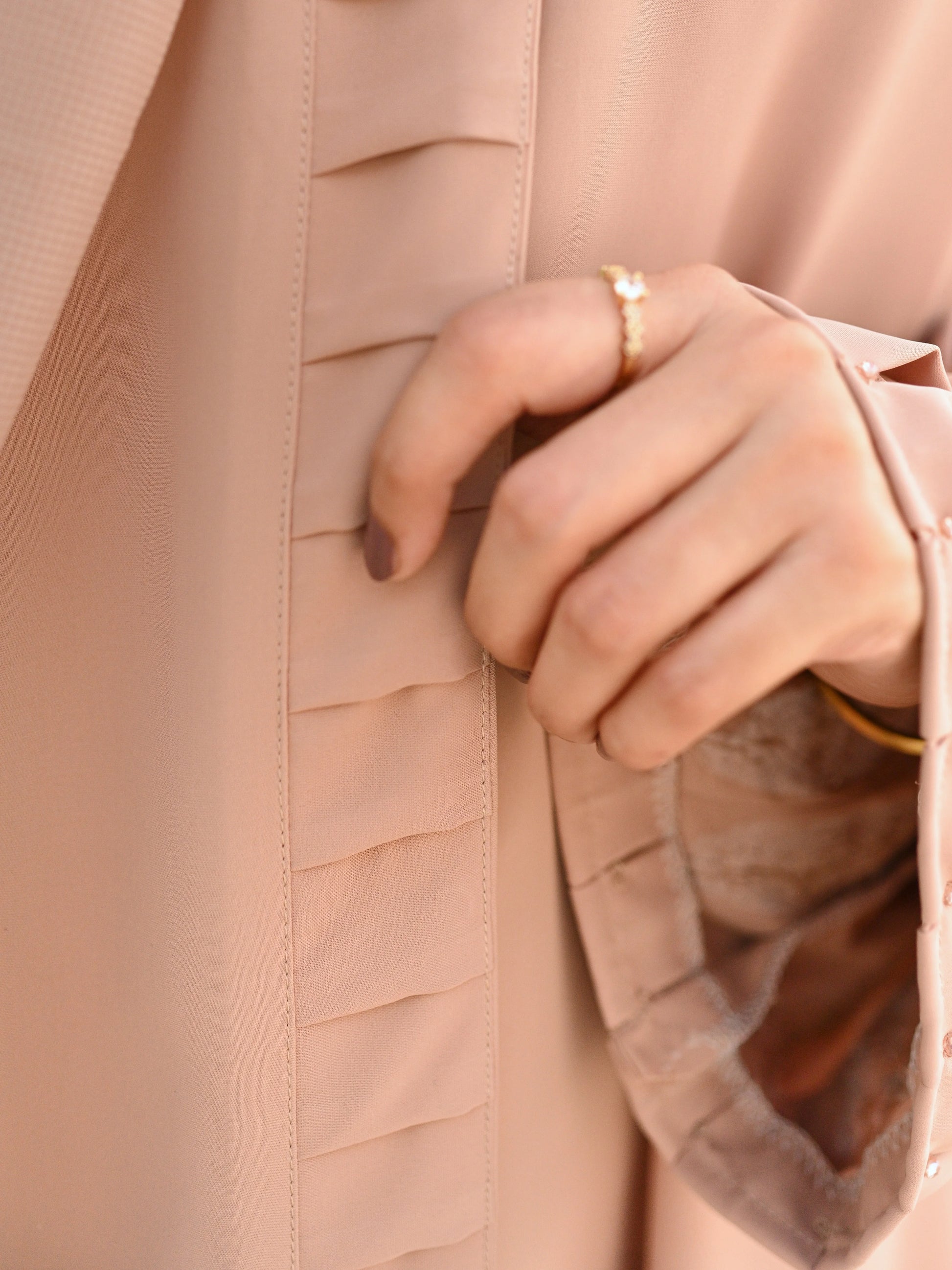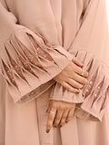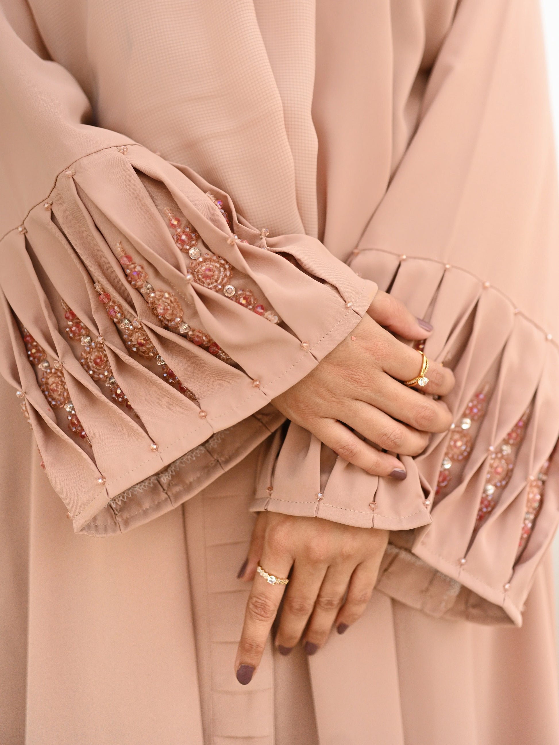 Exude charm in our Sahar Blush Abaya, featuring intricate crystal work and extensively pleated sleeves for a delicate yet statement-making festive look, complete with a graceful front placket.