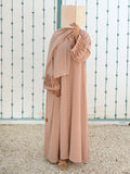 The abaya showcases delicate crystal embellishments and extensively pleated sleeves that add depth and elegance to the silhouette. A stylish front placket completes the design, giving it a regal and contemporary flair.