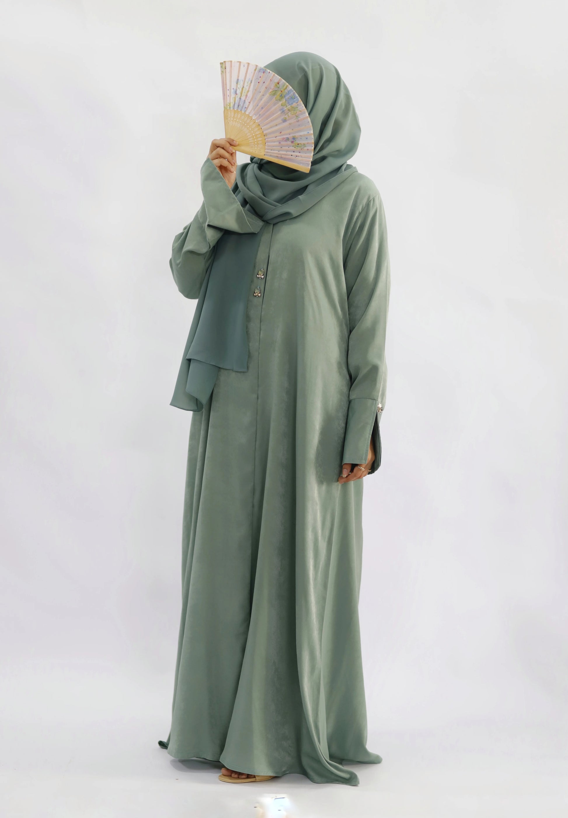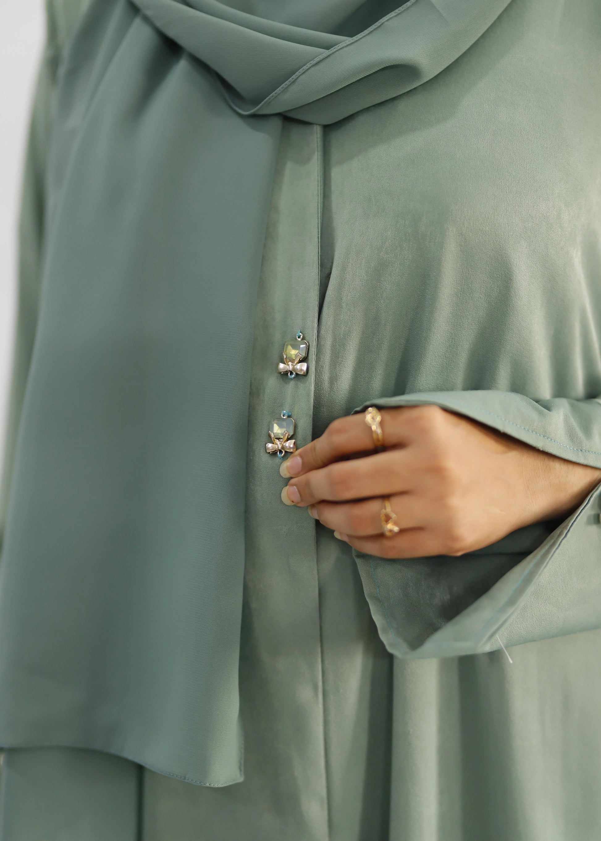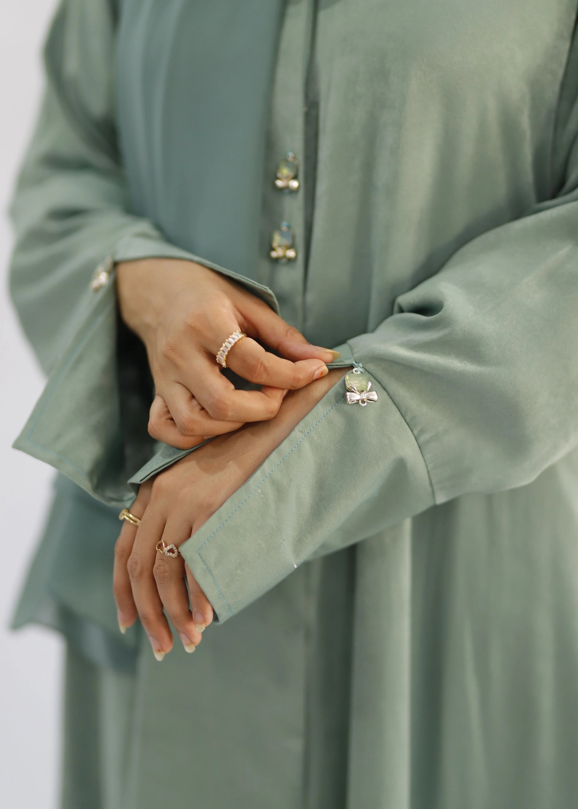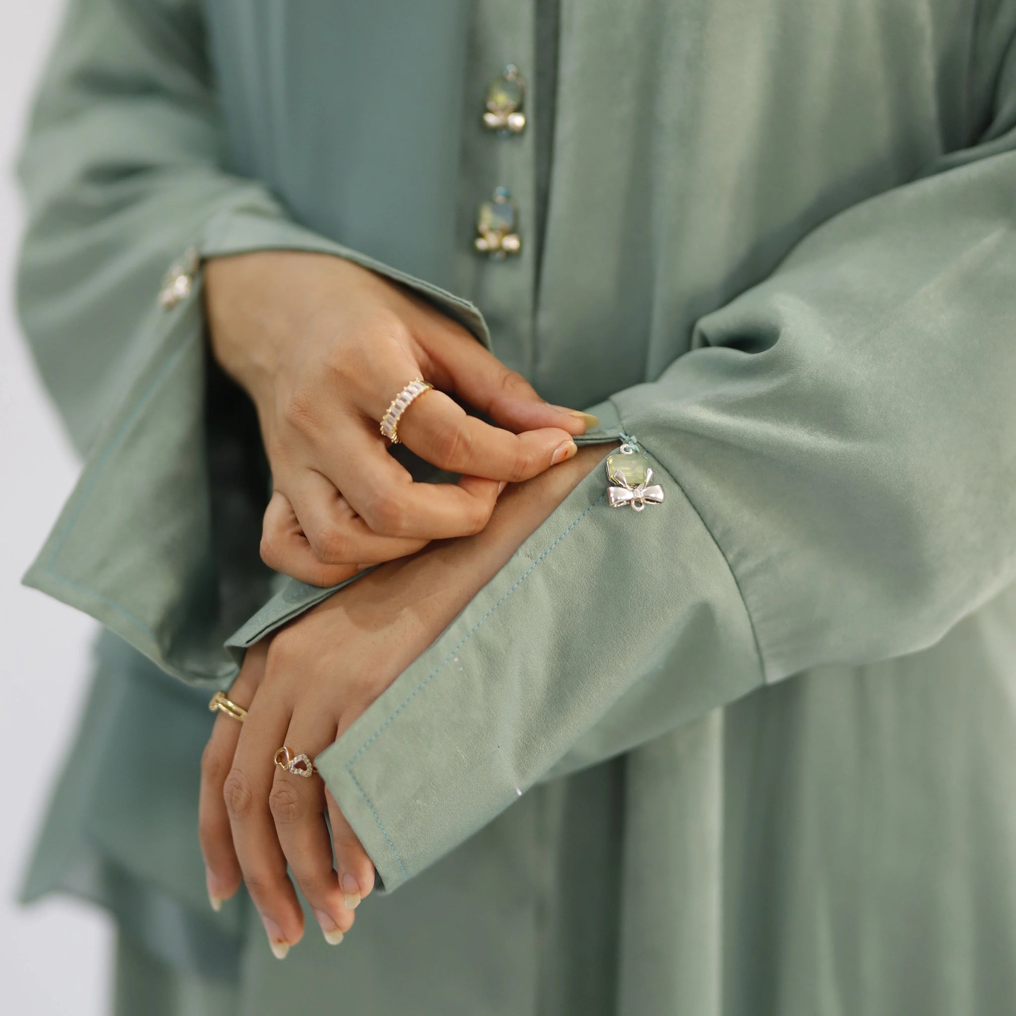 Elevate your style with our Pistachio Green Silk Abaya, adorned with delicate bow-style diamante buttons on the front and cuffs for a refined, feminine touch.