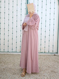 The abaya is adorned with intricate handwork, featuring sparkling crystals and beads that add shimmer and sophistication to your ensemble. Its soft mauve hue exudes femininity and luxury, making it a standout piece in any festive wardrobe.