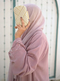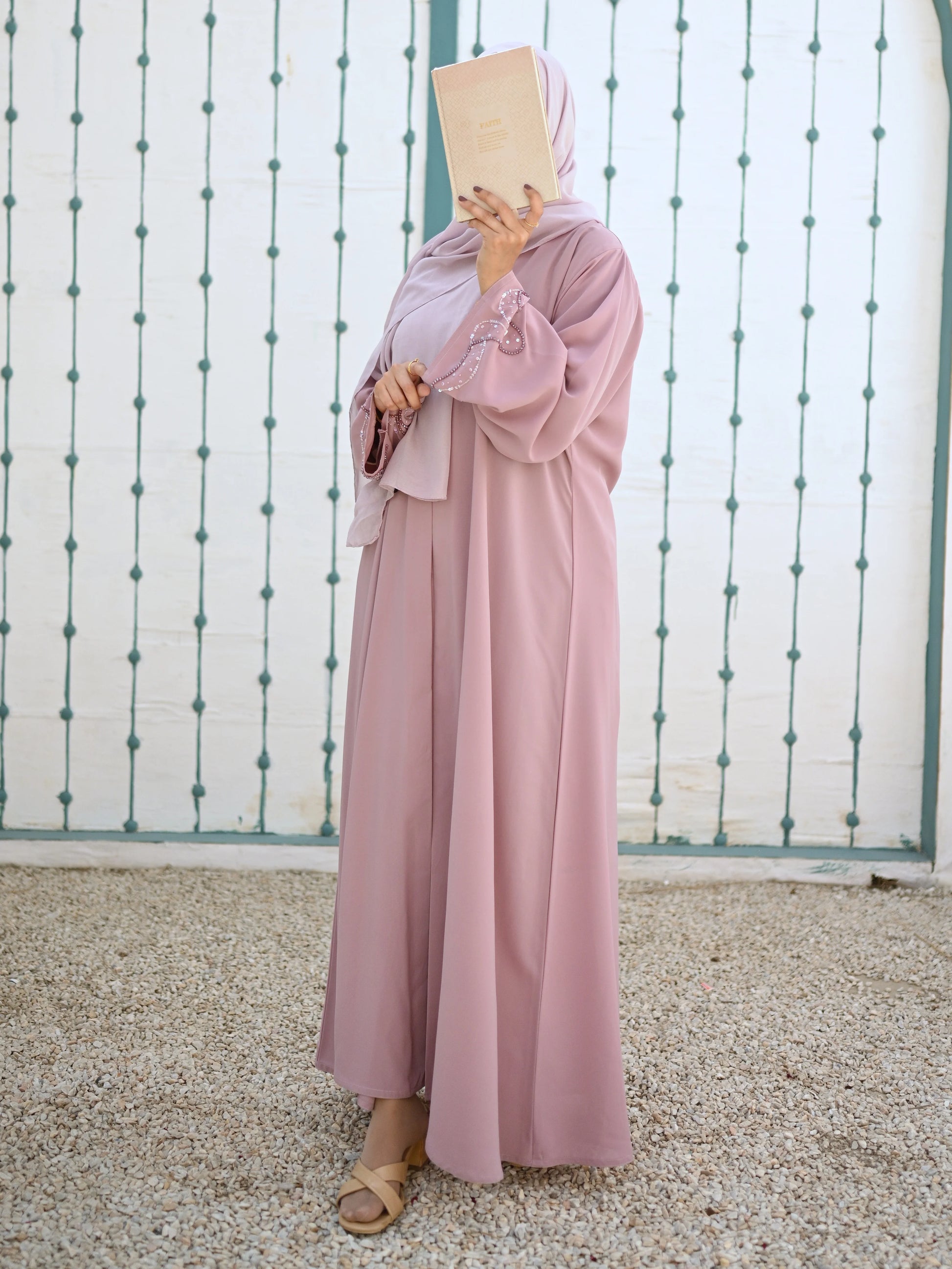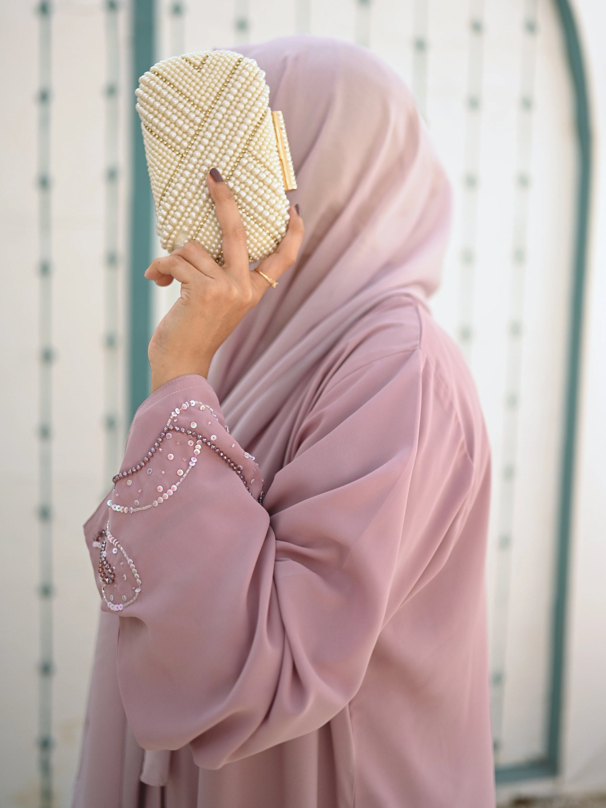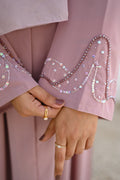 Step into elegance with this exquisite mauve abaya, featuring delicate handwork adorned with shimmering crystals and beads for a sophisticated, statement-making festive look.
