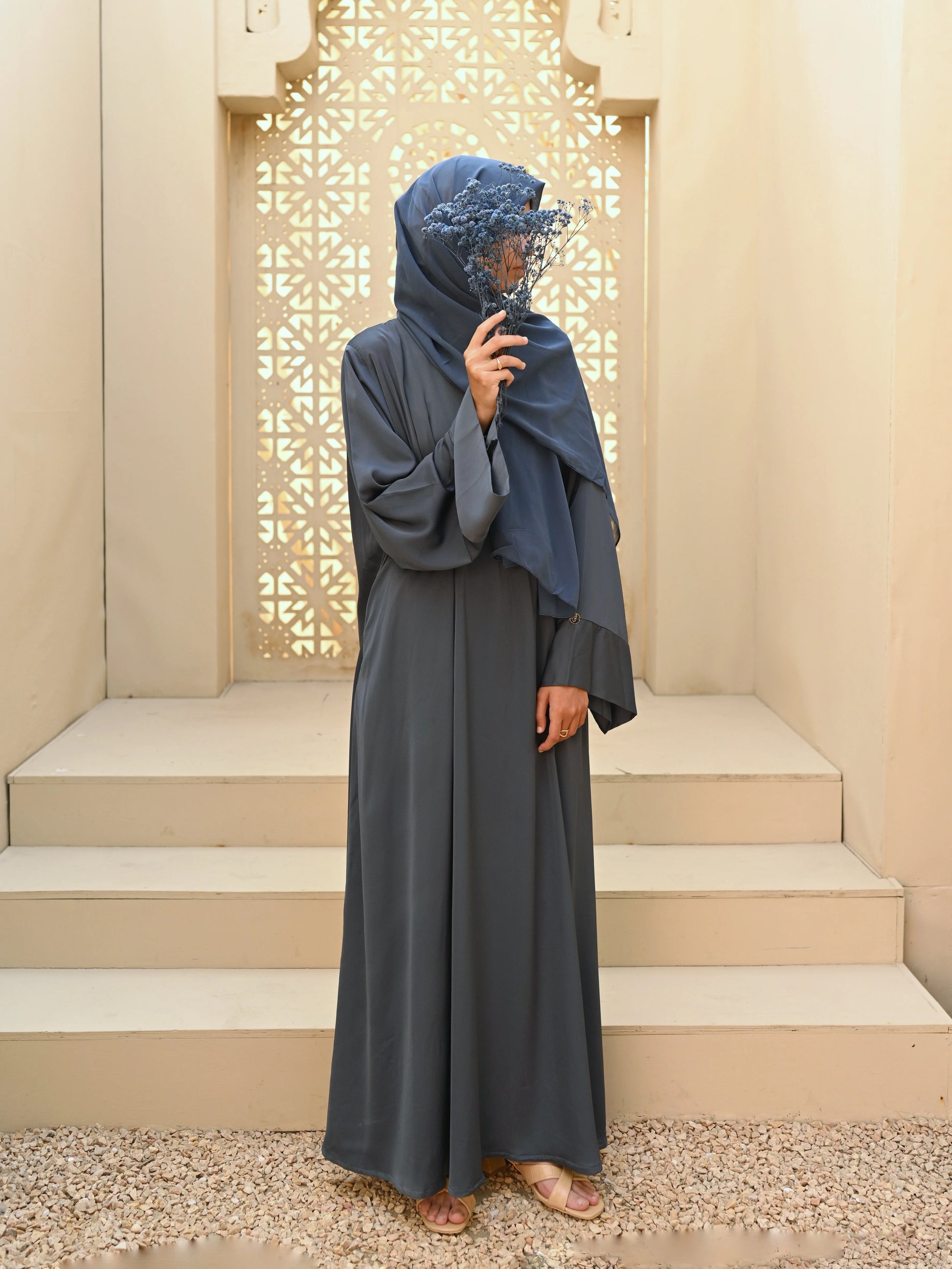 Each abaya comes as a complete set, including a matching chiffon hijab to maintain a cohesive, polished look from head to toe. The lightweight, airy hijab drapes beautifully and pairs perfectly with the abaya’s elegant sheen.