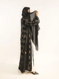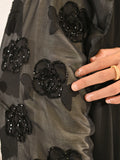 Crafted for refined layering, this black chiffon kimono features a graceful rose self print that adds subtle texture and depth to its flowing silhouette. The lightweight chiffon drapes beautifully, creating an effortlessly elegant look that moves with poise.