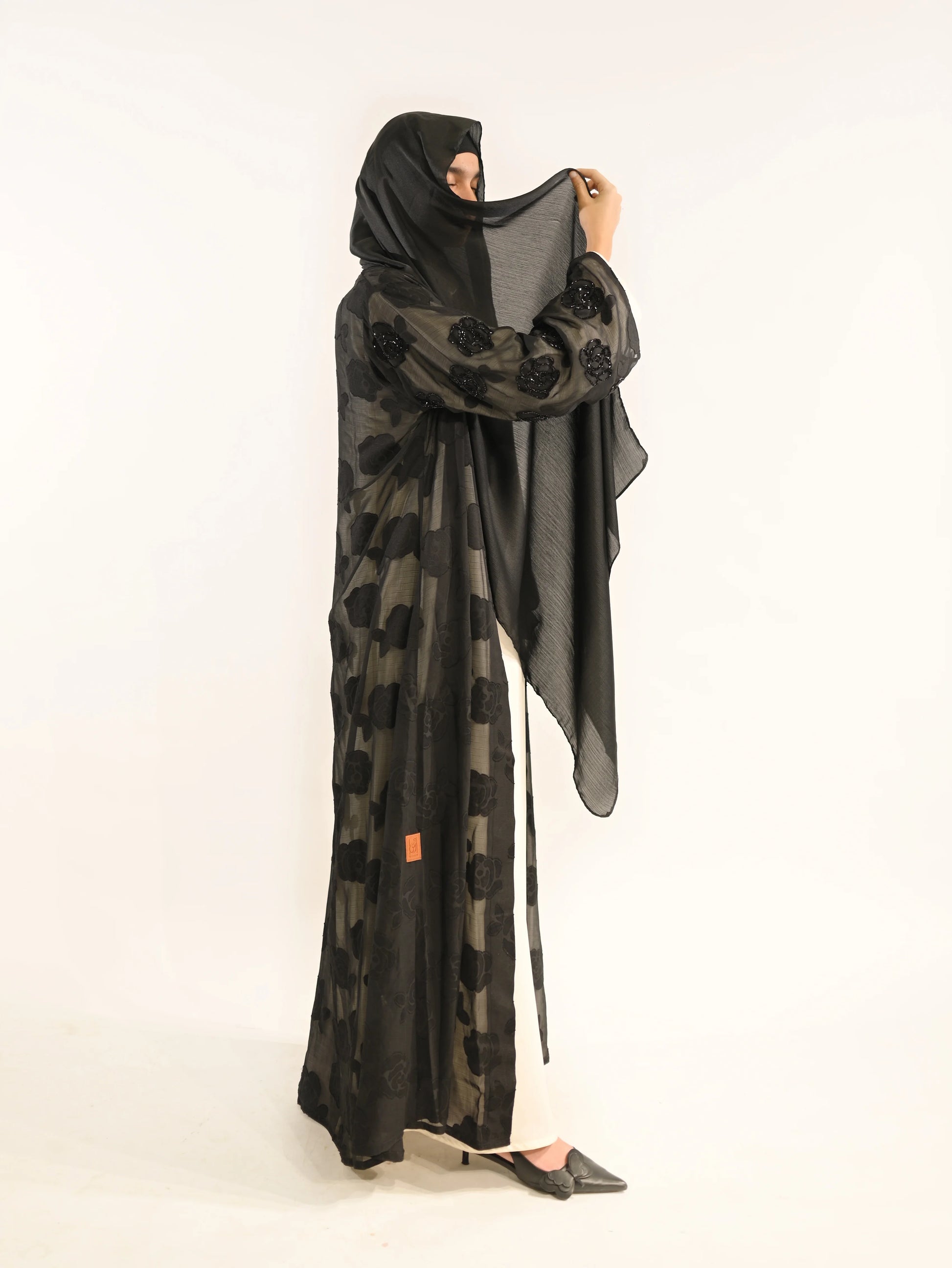 An elegant sheer kimono crafted in flowing chiffon, featuring a refined rose self print and delicate beadwork on the sleeves. Designed to be layered over an inner for a graceful formal look.