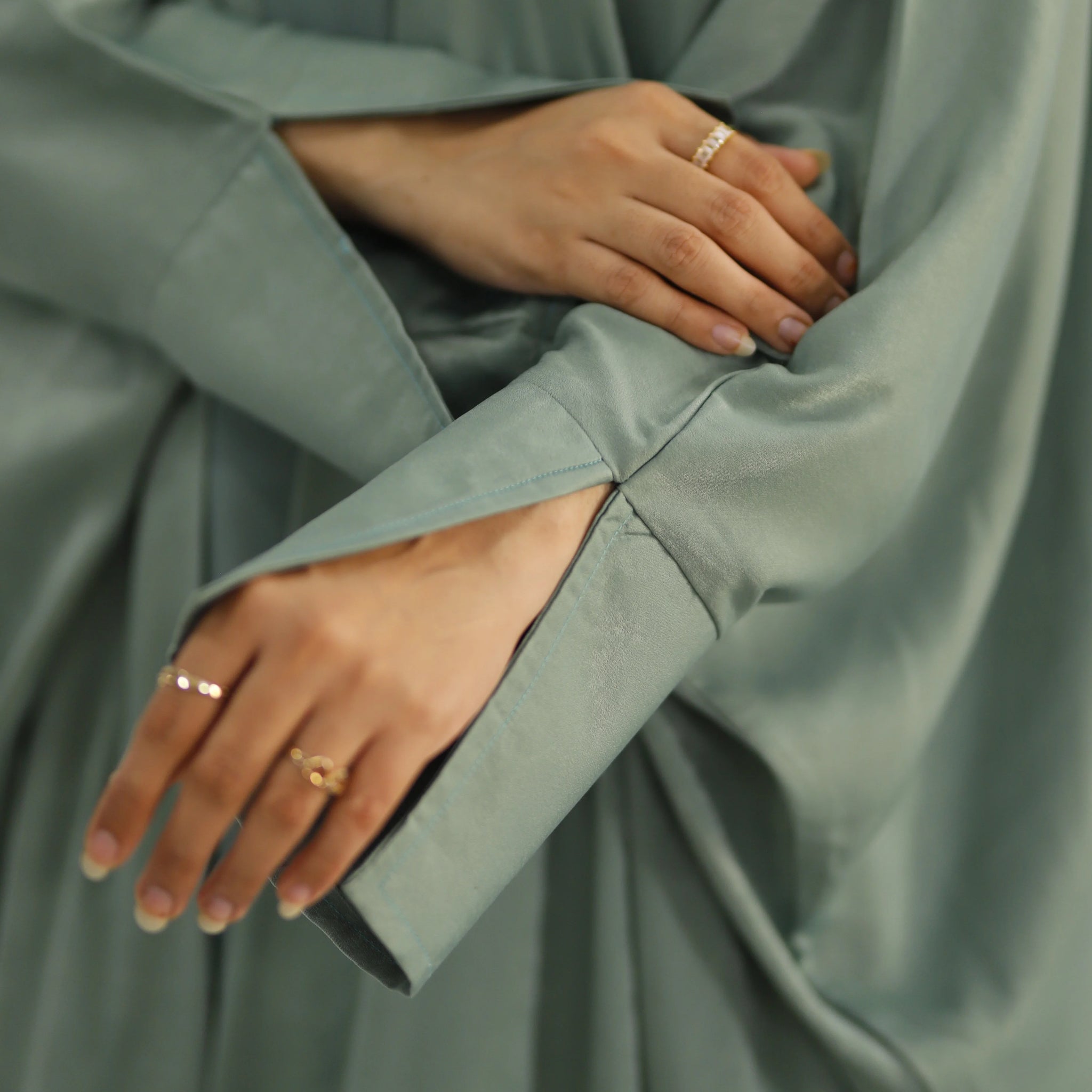 Embrace understated elegance with our Pistachio Green Silk Kimono, tailored in a graceful Emarati silhouette. Designed in premium royal silk, this front-open abaya offers a timeless look with a soft velvet-like finish that flows beautifully with every step.