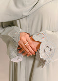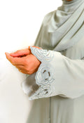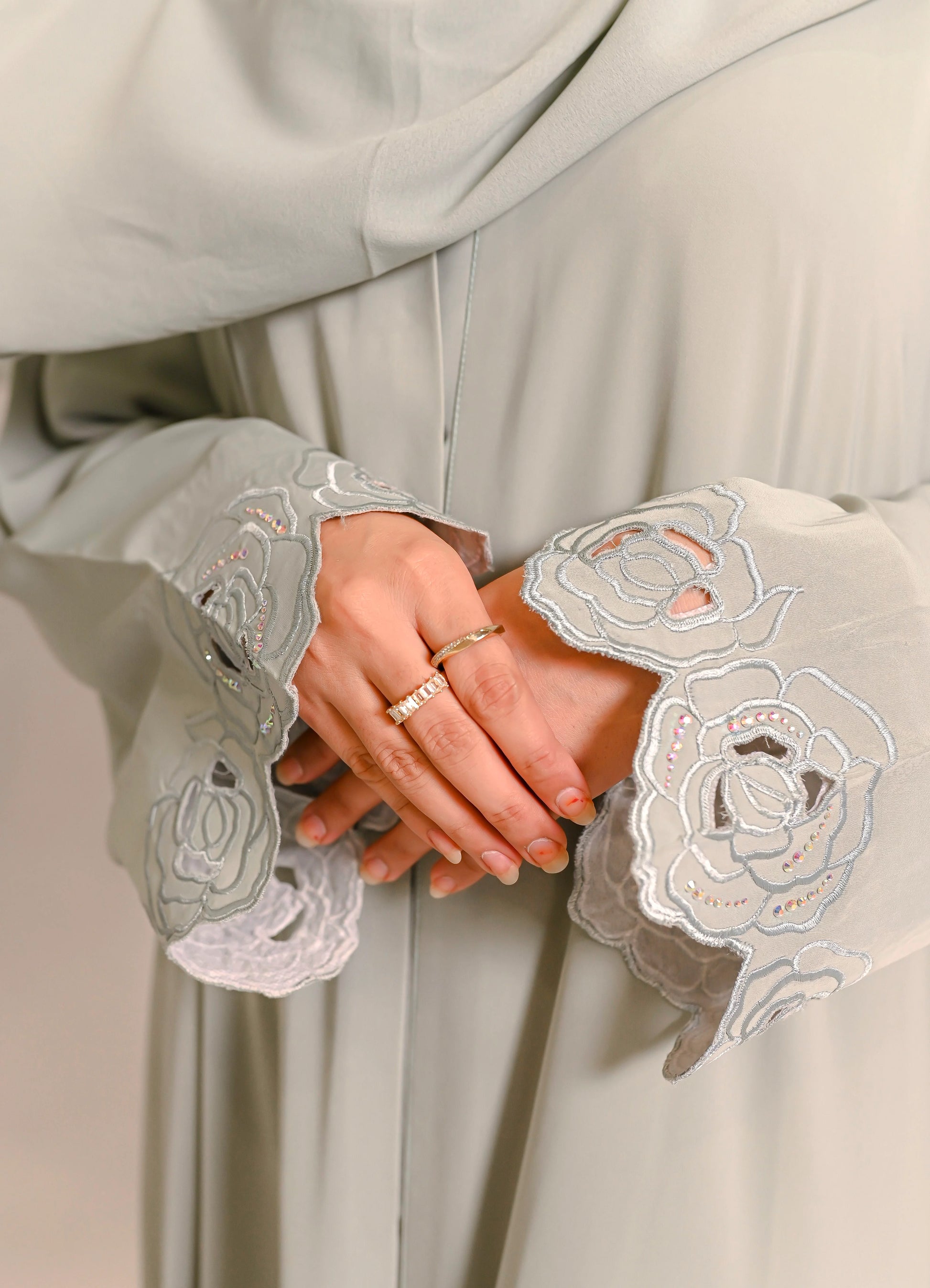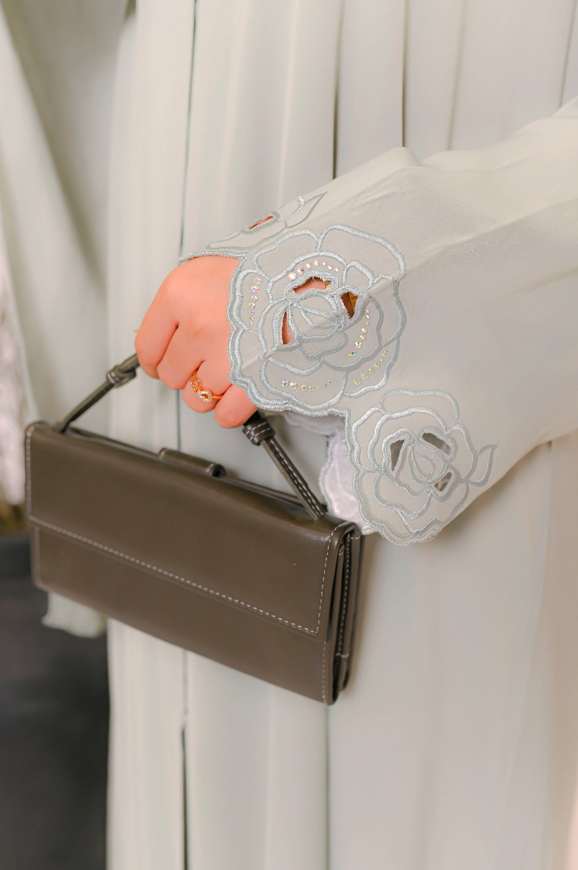 Refined and graceful, this tea green abaya features elegant rose cutwork on the sleeves with sparkling diamante embellishments for a feminine finish.