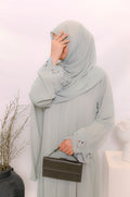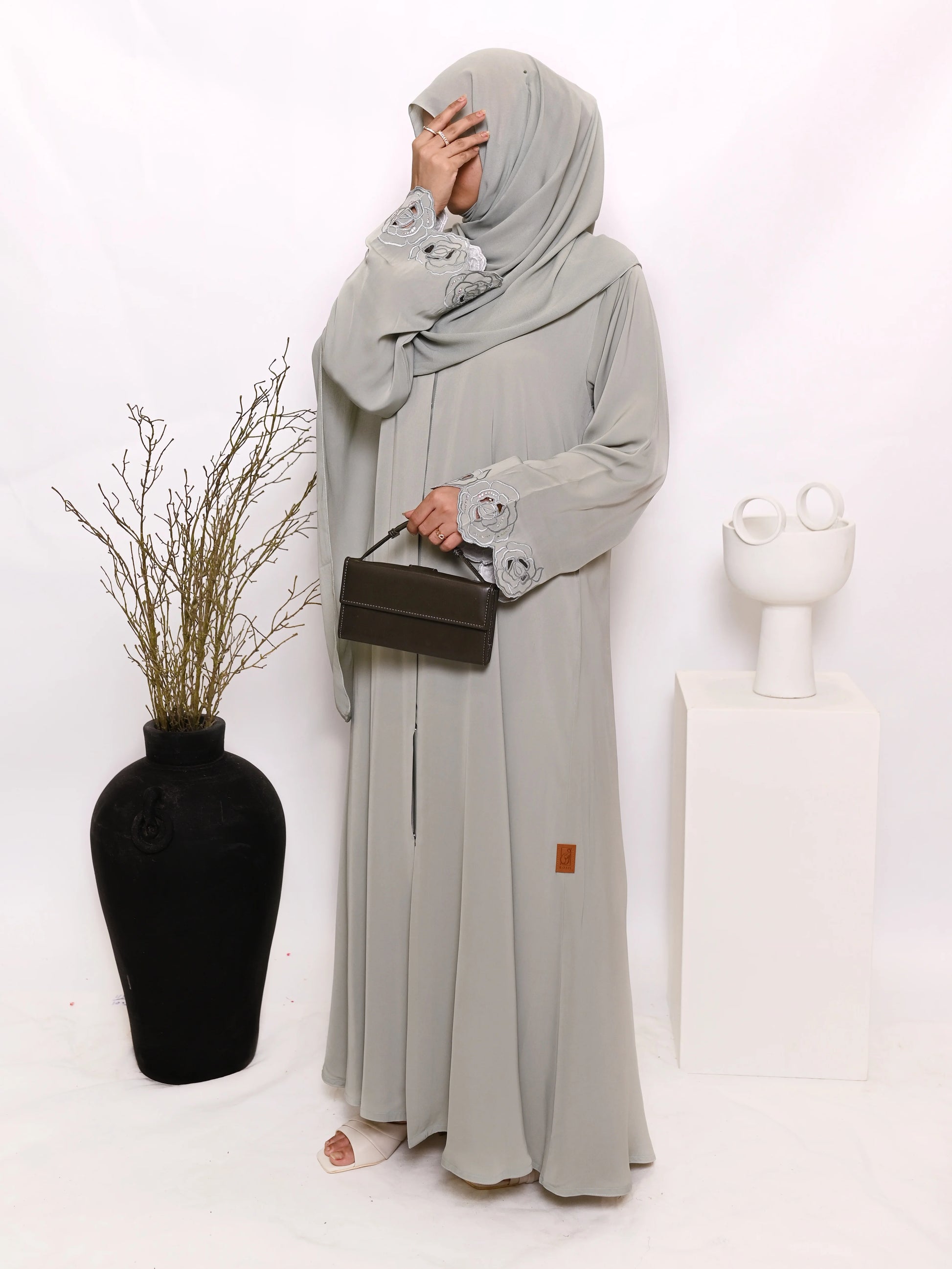 Step into understated elegance with our Tea Green Abaya, a beautiful piece crafted from lightweight georgette that drapes gracefully. The standout feature is the exquisite rose cutwork on the sleeves, paired with sparkling diamante embellishments that add a touch of shimmer and sophistication. The soft tea green shade makes it ideal for both daytime and evening occasions.