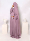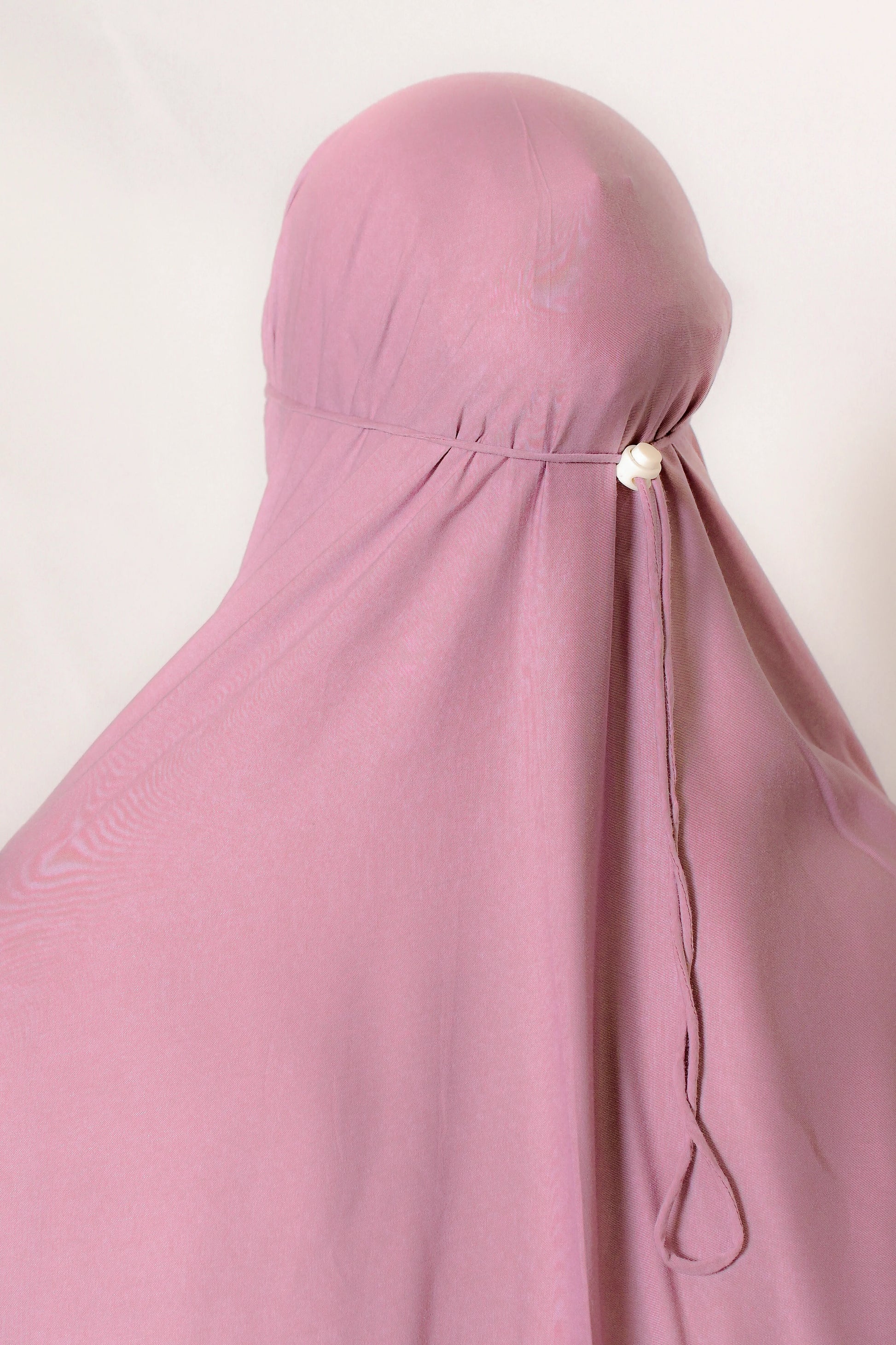 Its elasticated forehead and adjustable back cord ensure a secure fit, making it easy to slip on and wear throughout your prayer without constant readjustment. The delicate lace detailing on the sleeves adds a refined touch of femininity, making this prayer covering both functional and beautiful.