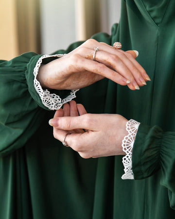 Its elasticated forehead and adjustable back cord ensure a secure fit, making it easy to slip on and wear throughout your prayer without constant readjustment. The delicate lace detailing on the sleeves adds a refined touch of femininity, making this prayer covering both functional and beautiful.