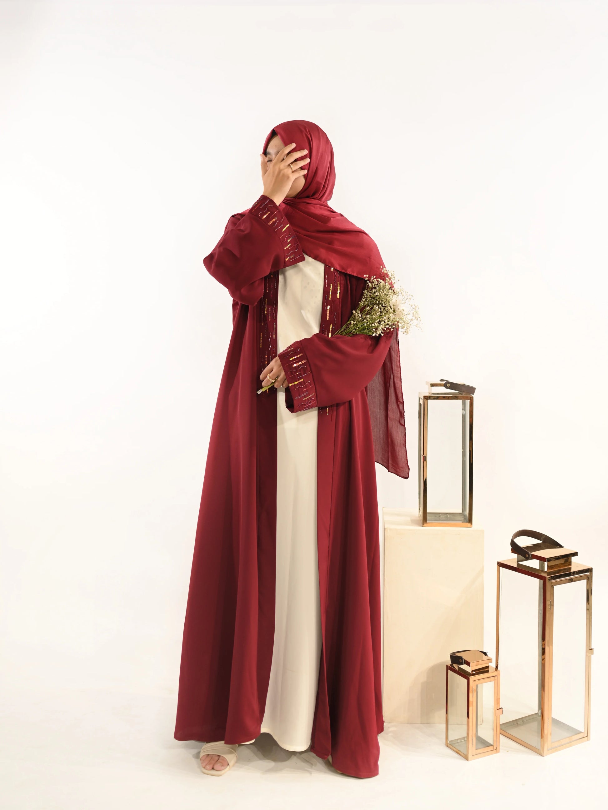 Balancing sophistication with comfort, this abaya reflects timeless elegance with modern refinement. A matching chiffon hijab (28 × 70) is included, completing the coordinated modest ensemble with ease.